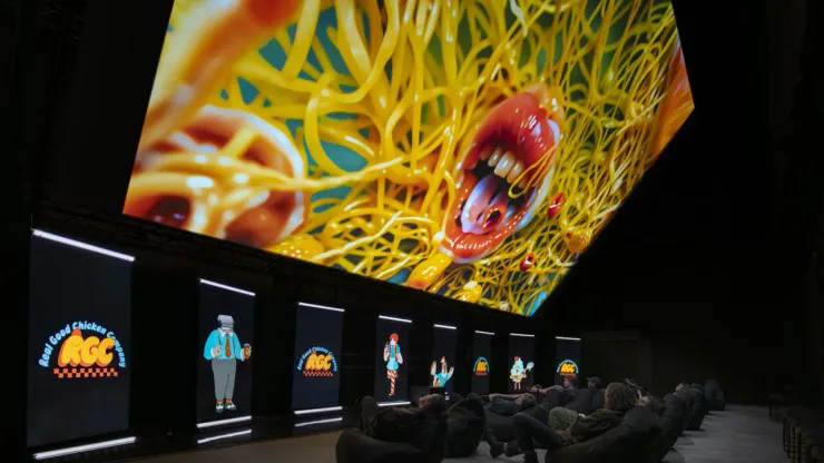 Since then, MLF have collaborated with and exhibited at institutions including the BFI Film Fund, Barbican Centre and Kew’s Royal Botanic Gardens. Their recent project Sweet Dreams, developed with the BFI Film Fund, blends film, theatre and digital production to create a surreal, walk-through narrative exploring the absurdity of fast-food mascots, consumer culture and ultra-processed products. “We worked with set designers, prop makers, and used virtual production, digital puppetry, 2D and 3D animation, and AI, combining digital and physical worlds,” McNicholas explains. “It was a one-hour processional story about a fast-food mascot, Chicky Ricky, experiencing an existential crisis; a spatial story blending film, theatre, and games.”