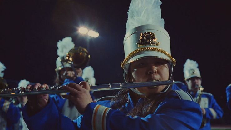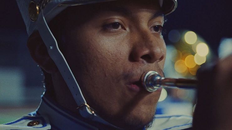 The marching band became a key expression of that. It allowed us to bring the song into the world in a way that felt both diegetic and distinctly American. A high school band on a football field is such an unmistakably American image. It also gave us a natural way to expand the scale of the film as the chorus hits.