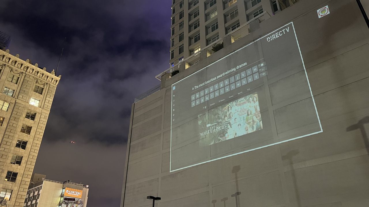 ABOVE: During this year’s Emmy Awards DirecTV promoted its Universal Search function by projecting video demos across Hollywood buildings, along with art from the night’s Emmy winners.