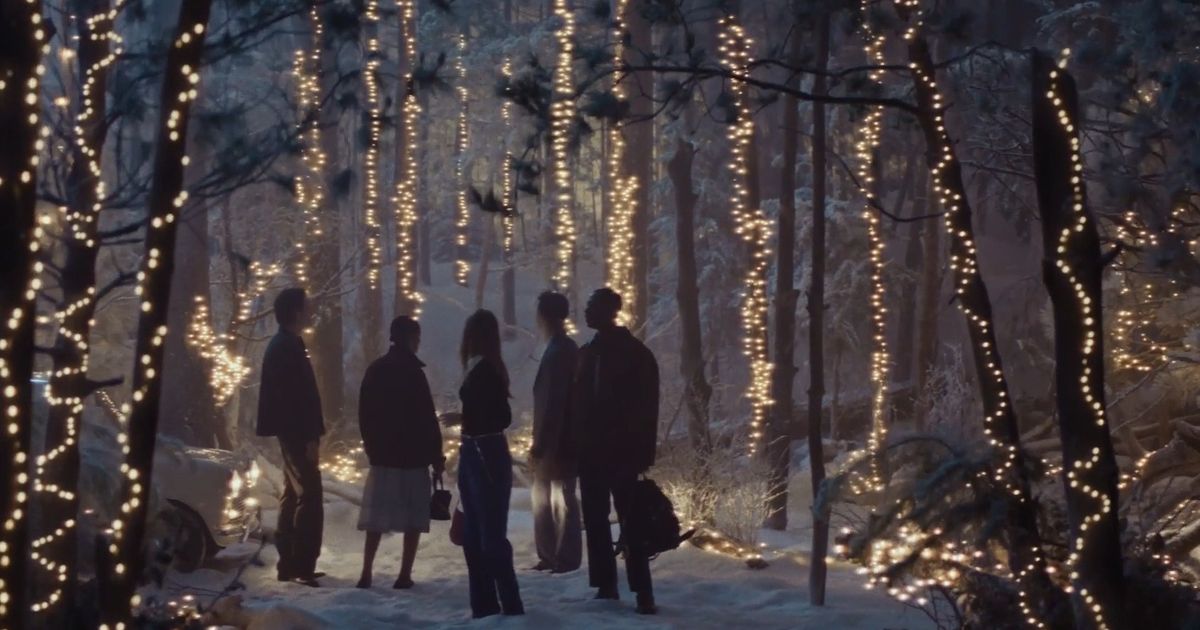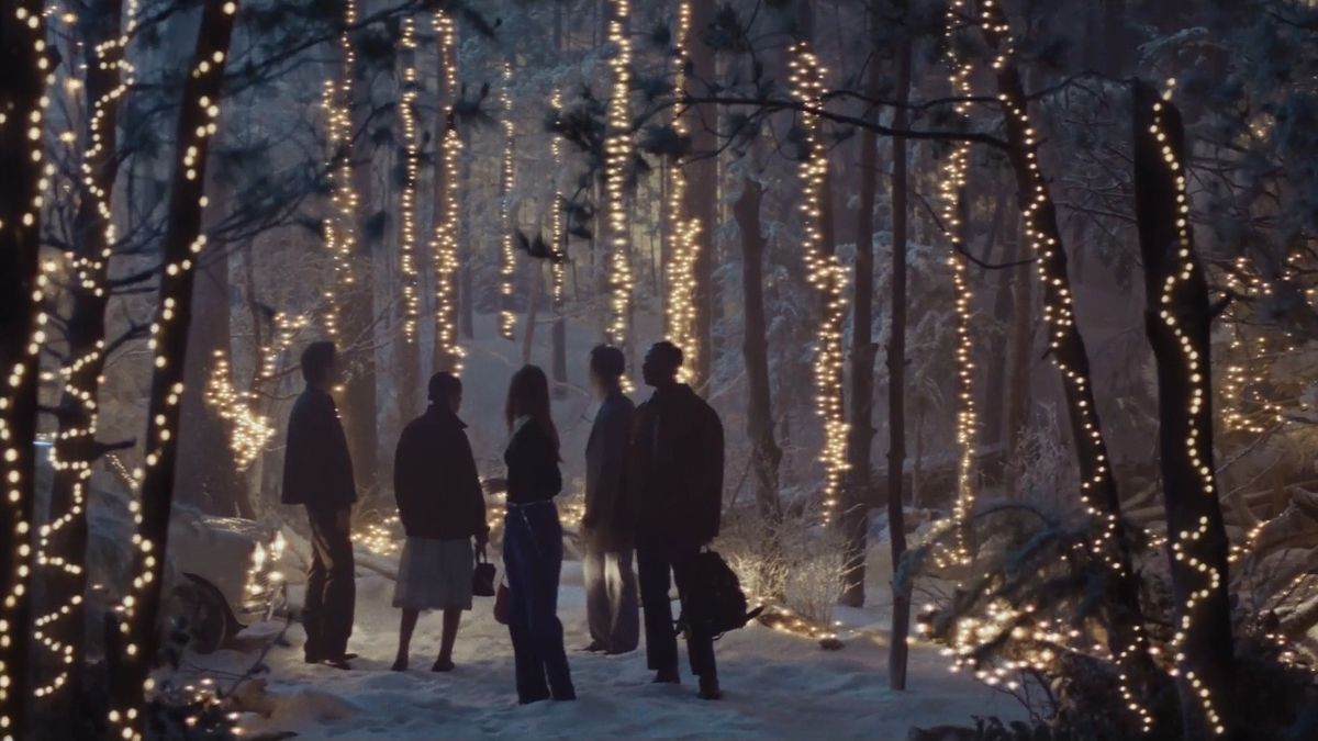 As the star-studded cast wind their way through a snow-covered landscape, they pause for a break in the woods when as the car’s vintage headlights flicker, the forest awakens, glowing with countless fairy lights that stretch into the distance.