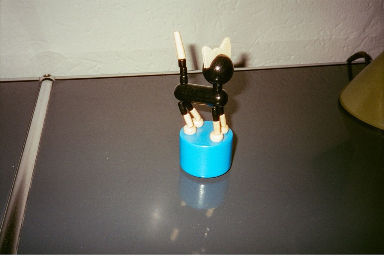 This is a wooden push puppet – a cat figure mounted on a blue base.