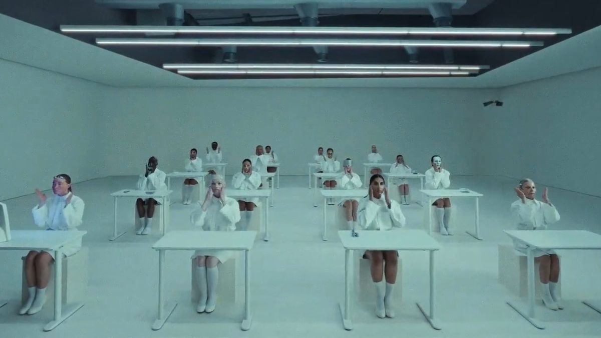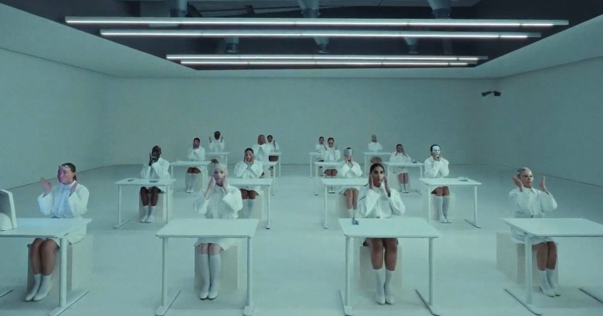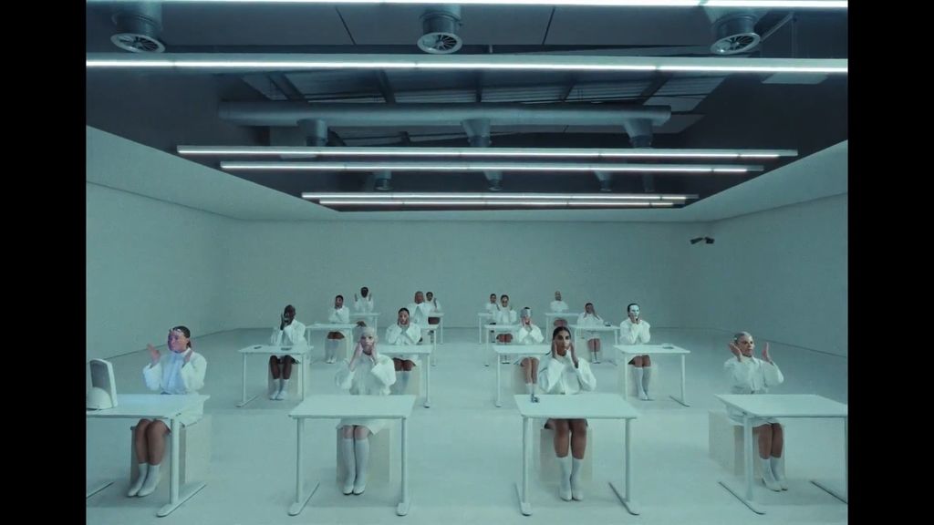 Set under harsh fluorescent lights, the dystopian classroom scene is filled with eerie chanting and clinical precision as students peel, distort and freeze their faces, until one finally stands up to see the truth.